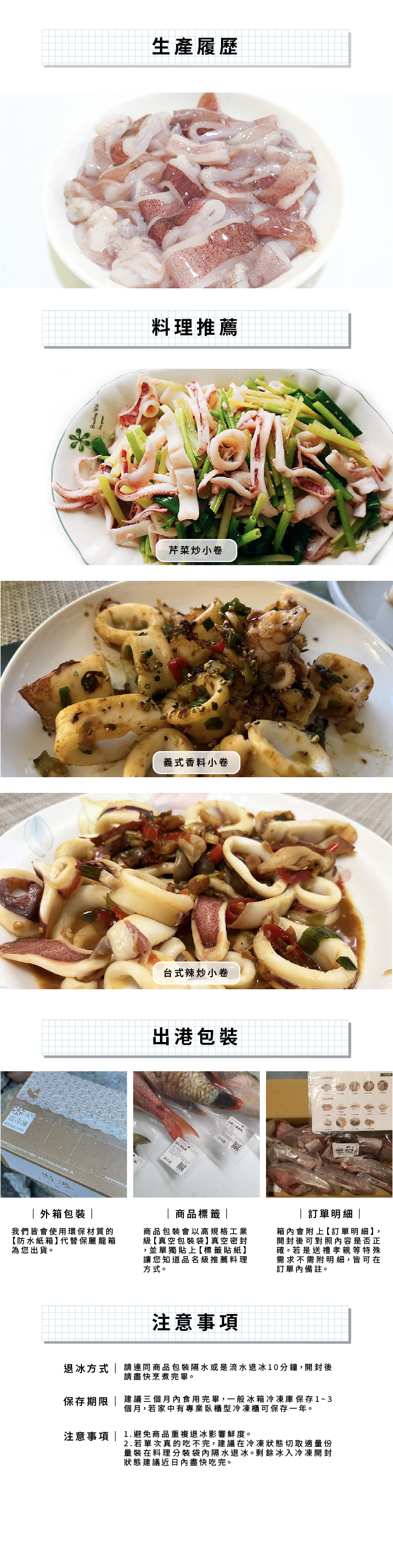 ▲ 小提醒|此商品已經將不可食用的部位,例如:小卷軟骨片、口、眼睛等去除,剩餘部分有身體肉、小卷腳,平均分配唷。