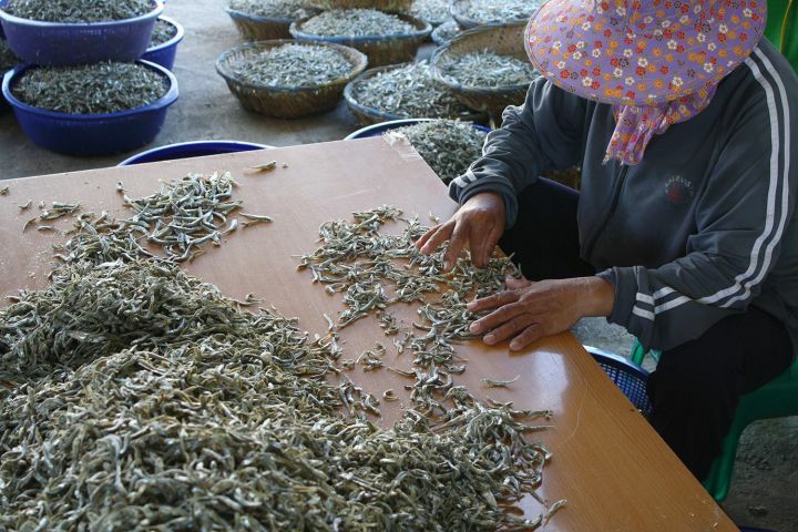 處理|由新鮮『中』丁香魚(3~5公分) 川燙後,經過陽光海風日曬製成魚乾。