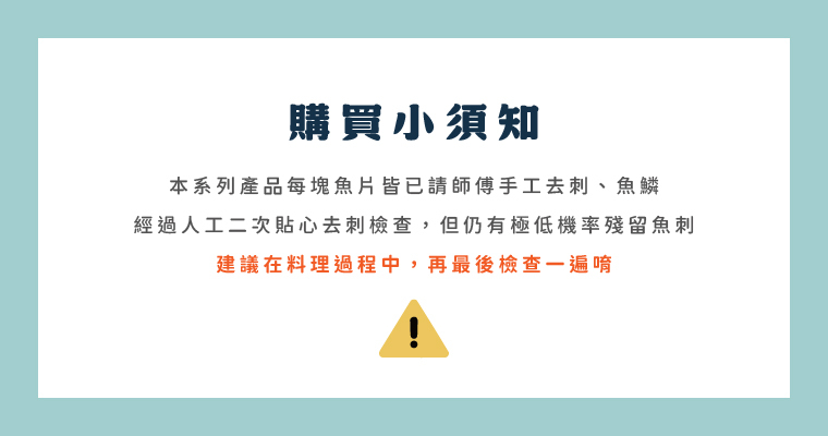 小提醒|本系列產品每塊魚片皆已請師傅手工去刺、魚鱗,經過人工二次貼心去刺檢查,但仍有極低機率殘留魚刺,建議在料理過程中,再最後檢查一遍唷