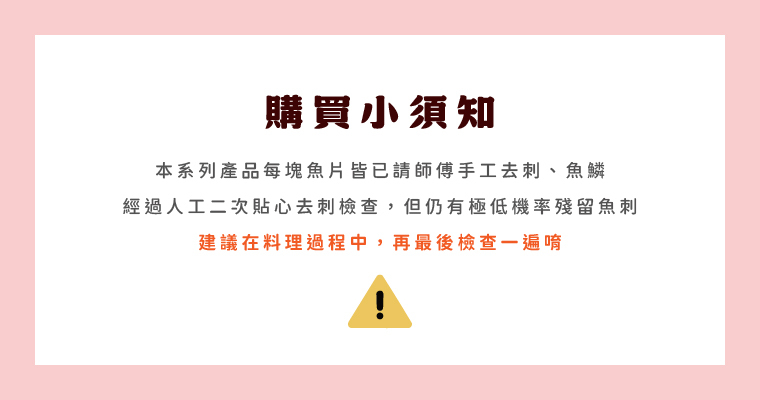 小提醒|本系列產品每塊魚片皆已請師傅手工去刺、魚鱗,經過人工二次貼心去刺檢查,但仍有極低機率殘留魚刺,建議在料理過程中,再最後檢查一遍唷