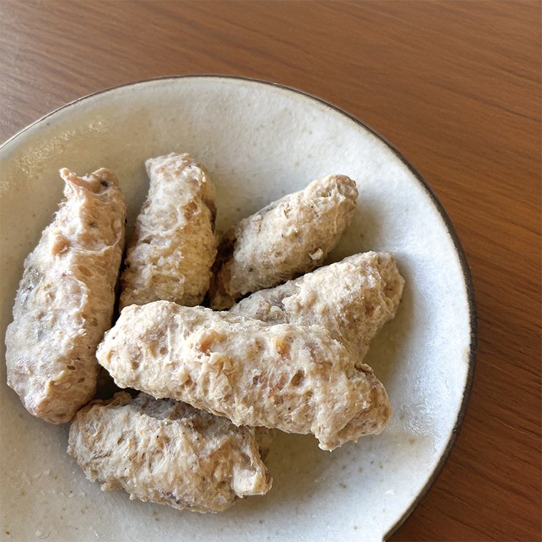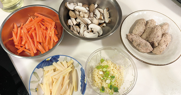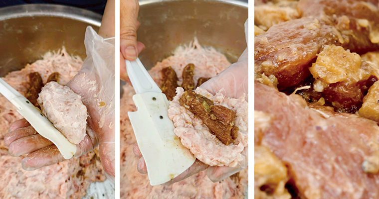 內層:夾心豬肉條(台灣)、黑胡椒、白胡椒、紅蔥酥、鹽巴、糖、醬油。